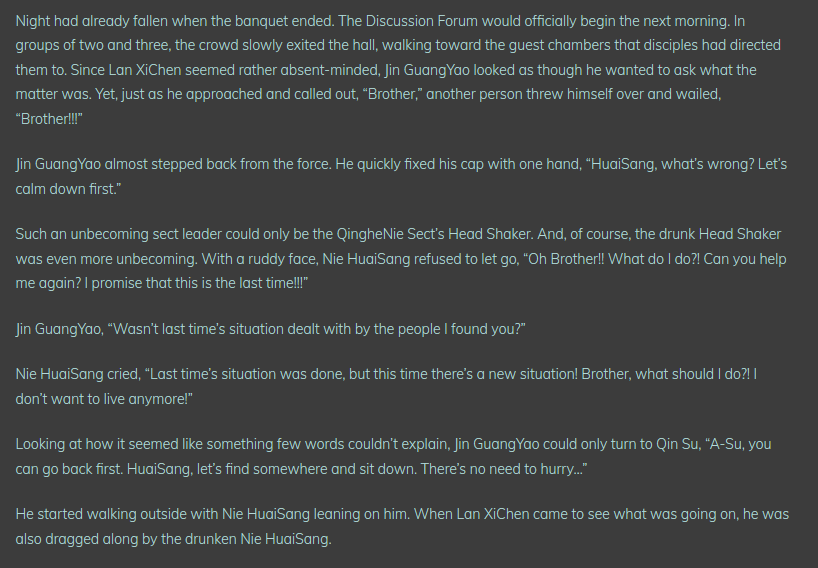 and so he hides himself in plain sight, and neither of them seems to find anything off about him at all as they exit to a different area of the tower, where huaisang continues to cry on them both and keep them distracted.]